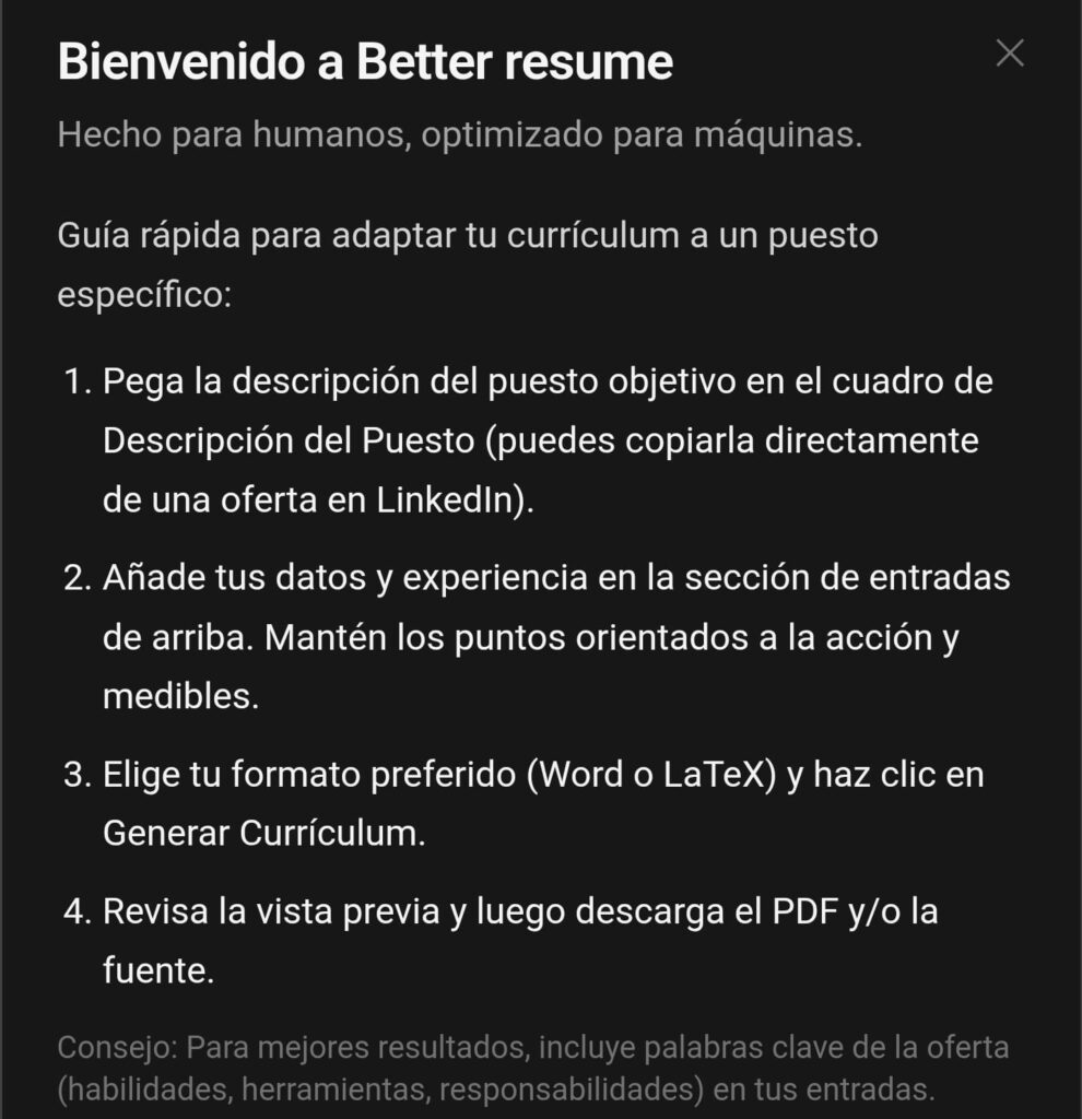 A partir de esa experiencia personal, Dalton desarrolló BetterResume, una herramienta que automatiza este proceso. La plataforma permite ingresar la descripción de la vacante junto con la experiencia laboral, nivel educativo y datos personales, y genera un currículum optimizado para ATS utilizando modelos de lenguaje y técnicas de análisis del puesto.